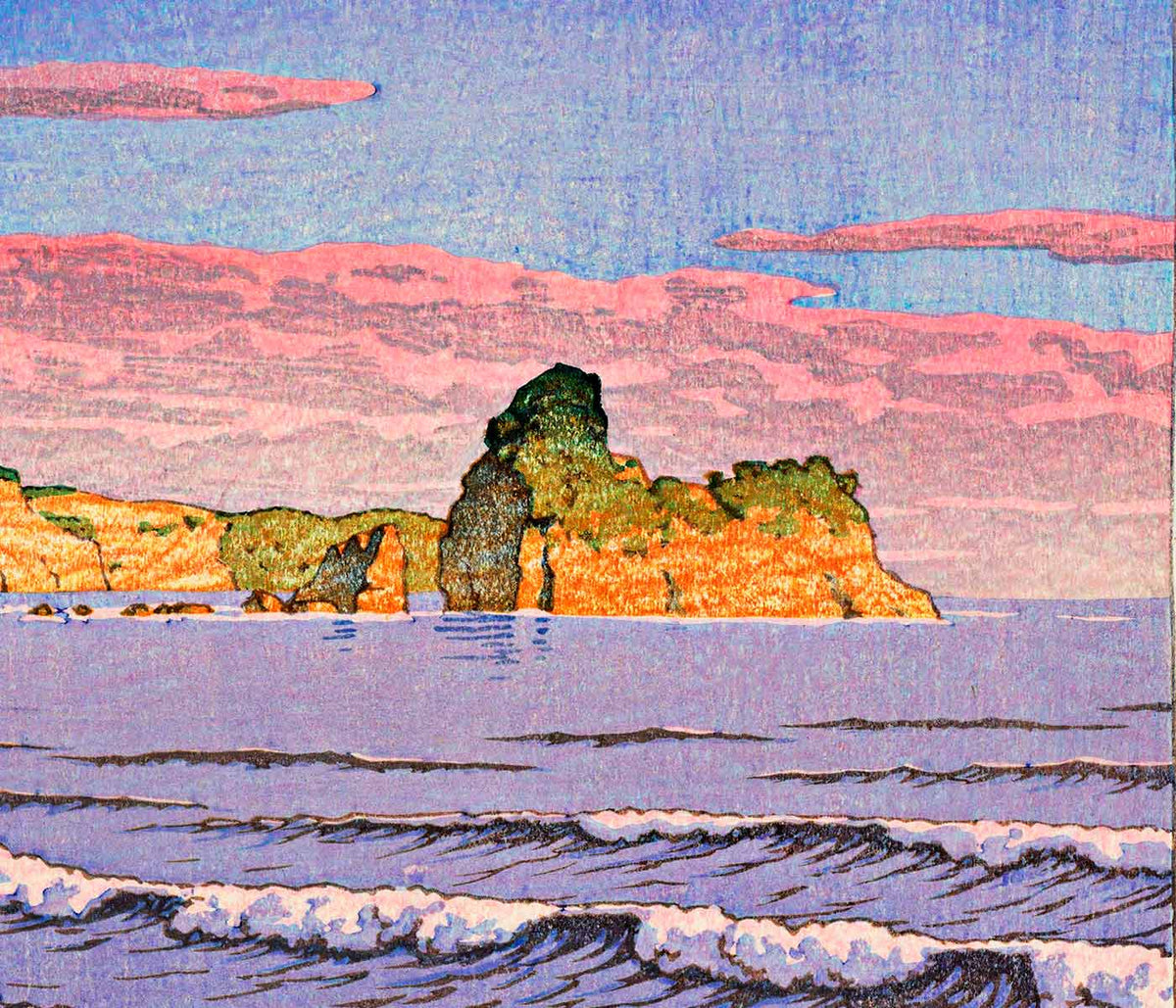 Kawase Hasui · 1931 · Serene ocean poster with dawn sky, foaming waves, and a distant lighthouse
