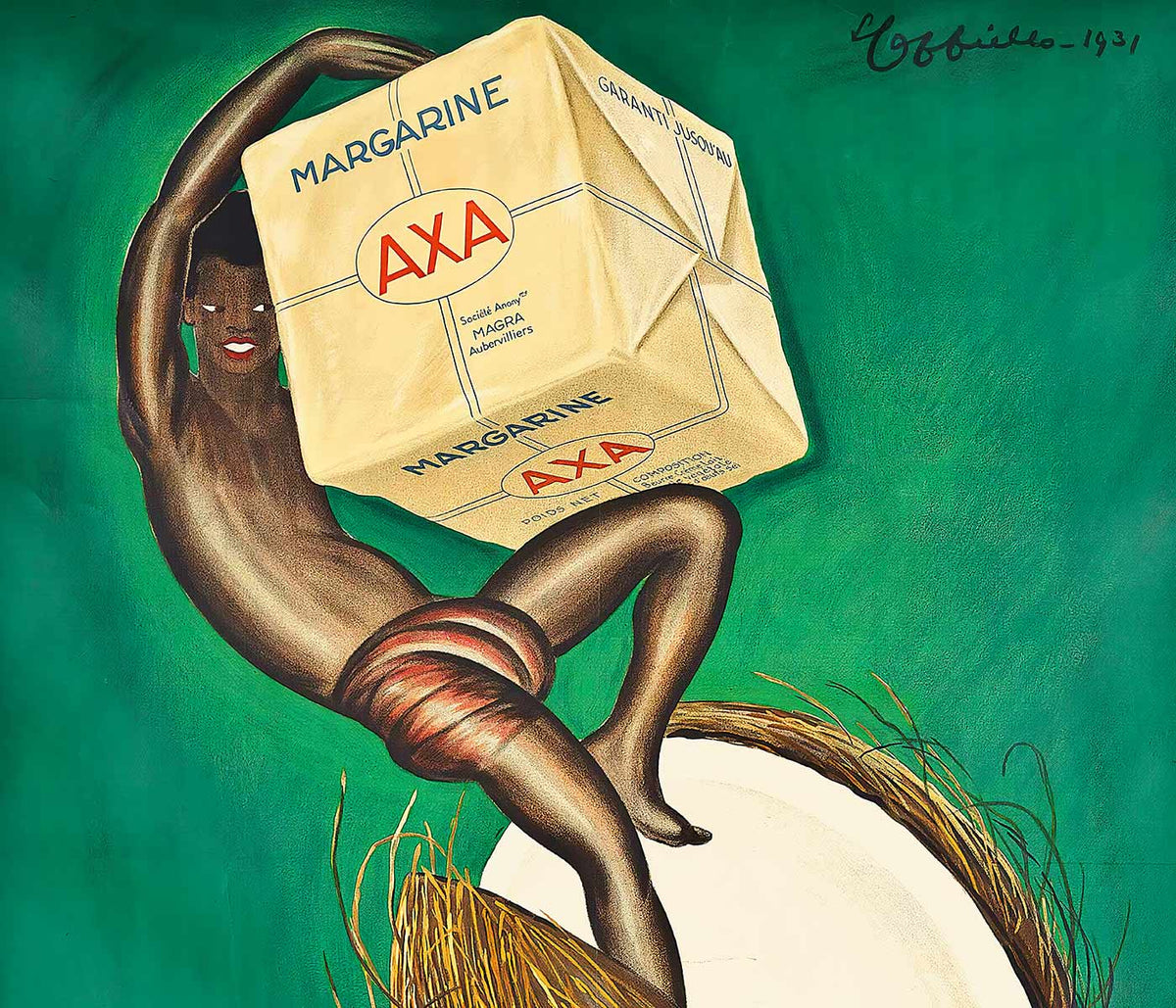 Leonetto Cappiello · 1931 · Bold Margarine Axa poster with striking figure, green backdrop, and sunny yellow highlights
